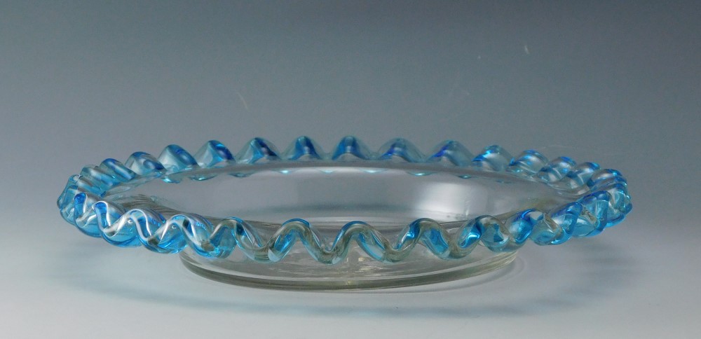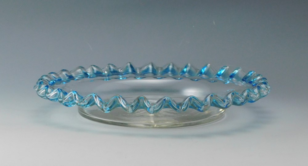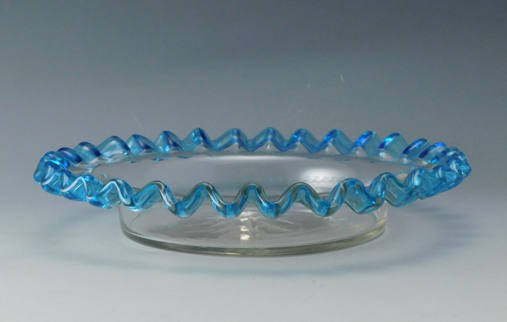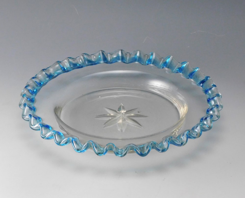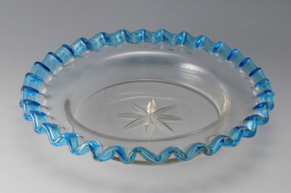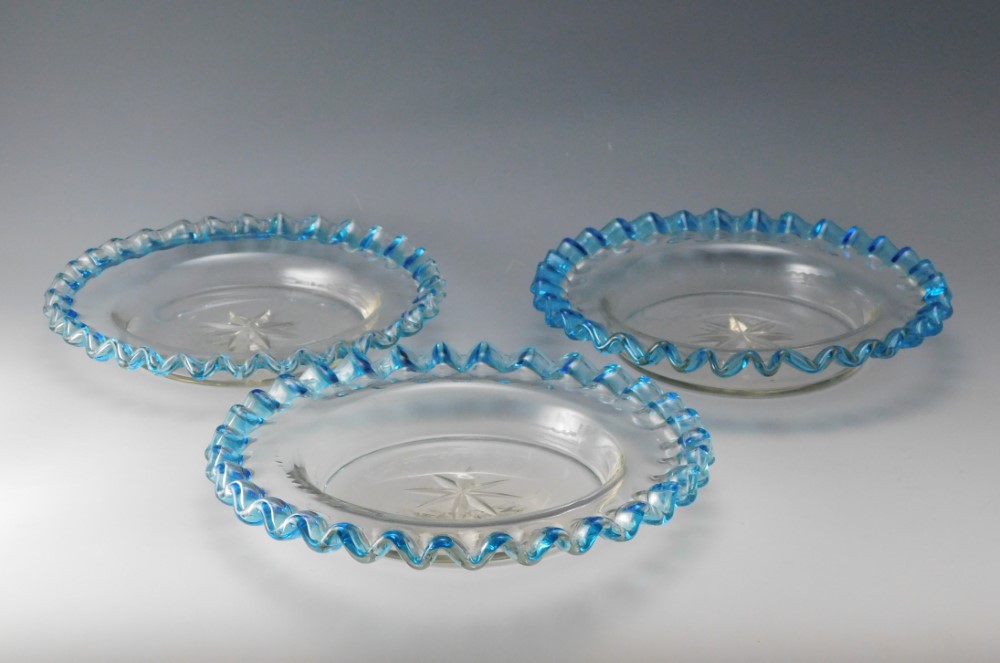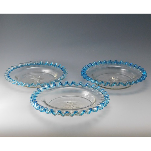 花弁のように波打つ縁を、青色で彩ったガラス皿三枚です。明治・大正期に実際に使われていた食器で、果物皿やデザート皿として用いられていたと思われます。
