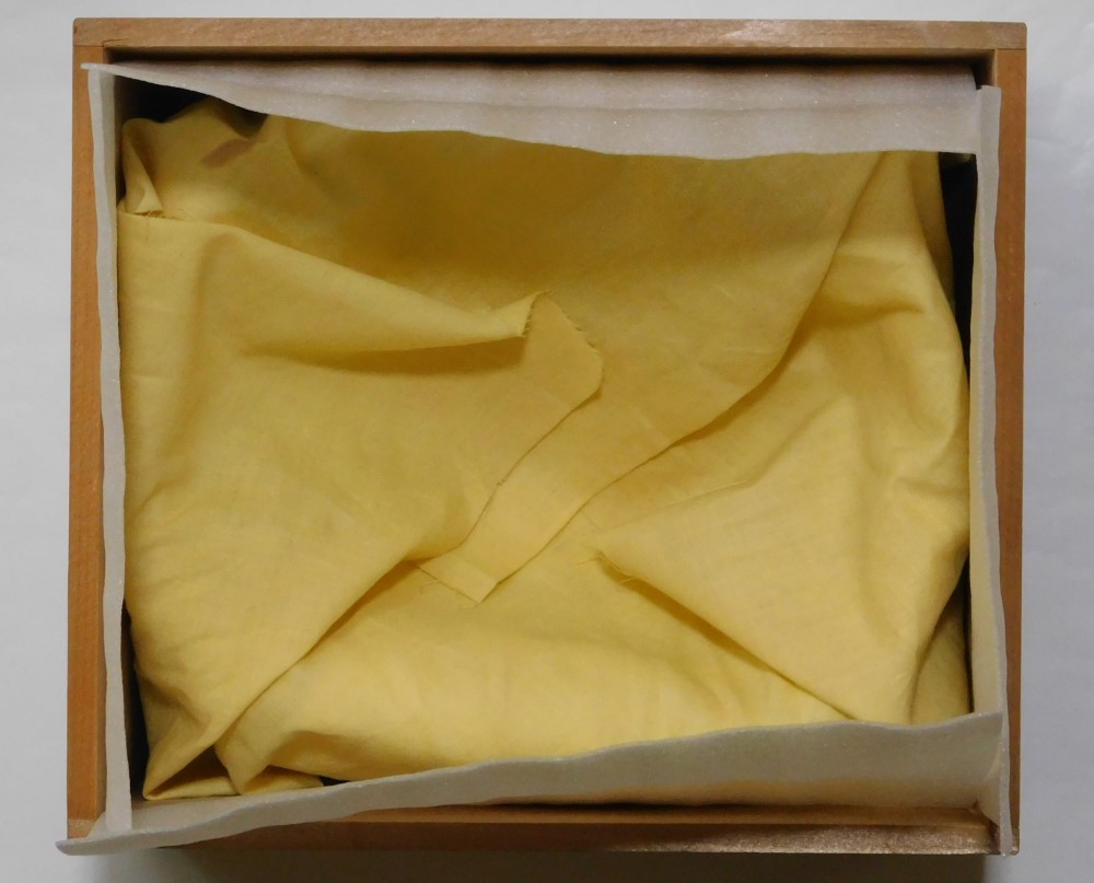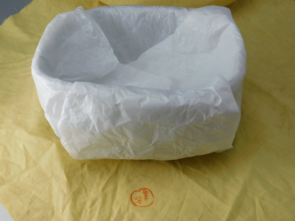 状態は無傷完品であり、目立つようなシミ、汚れなく、未使用にちかいといえます。付属品は共箱と共布、しおりであり、さらに当店で薄葉紙と箱かぶせ紙を用意させていただきました。