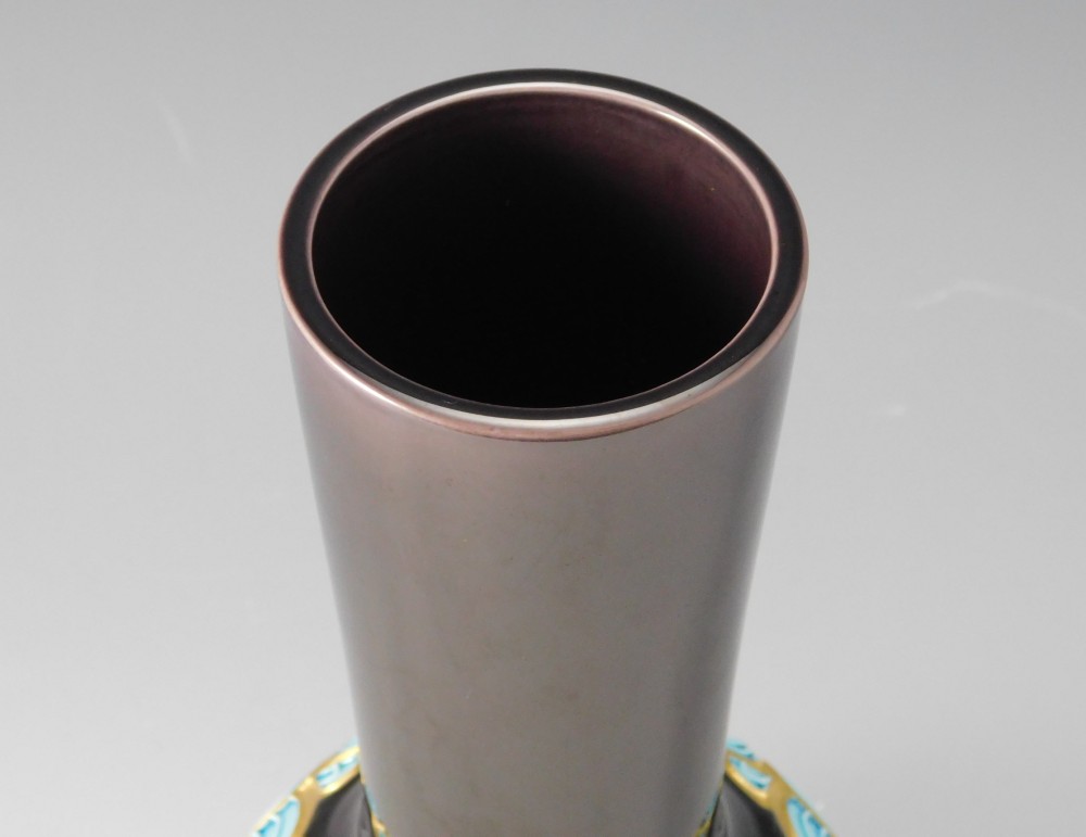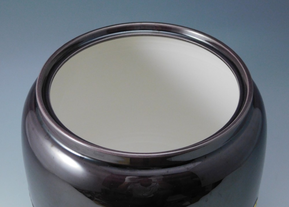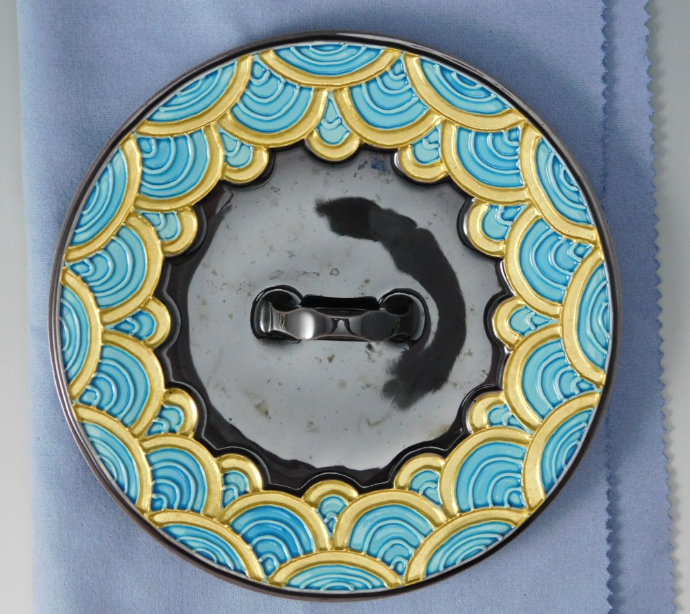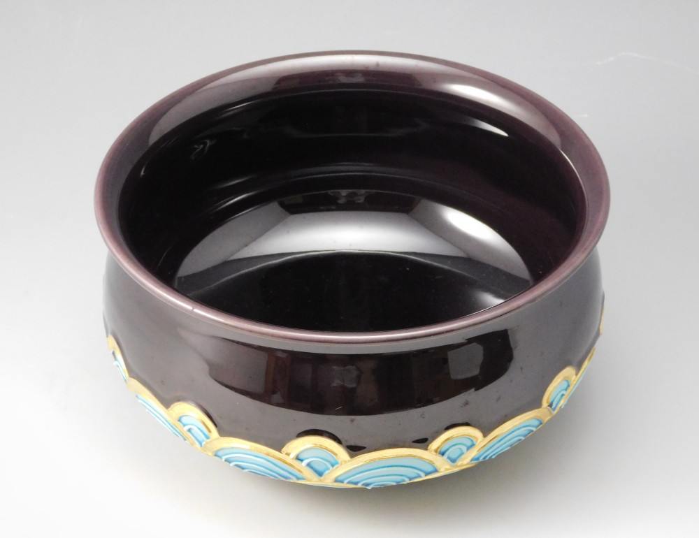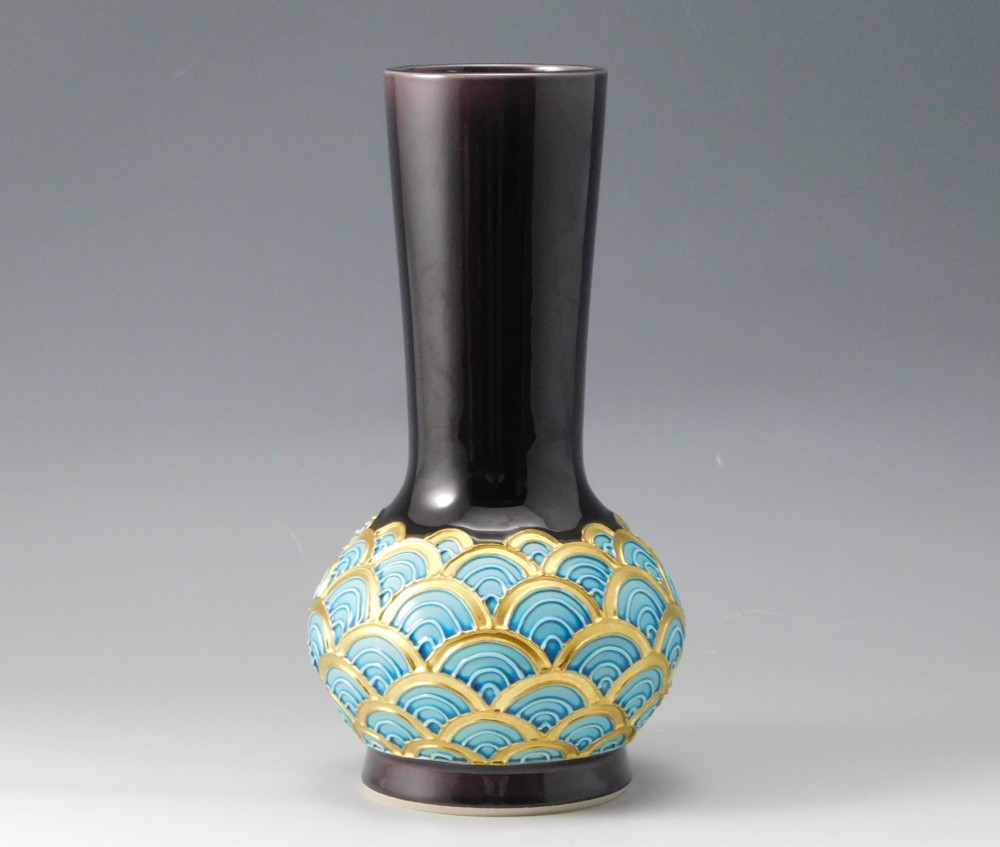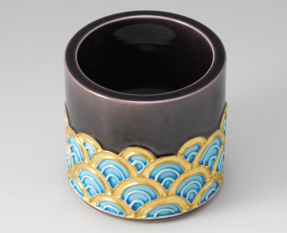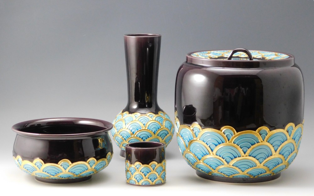 深みのある紫に、金彩と青で描かれた青海波文様が美しい皆具のひと揃えです。幾重にも重なる青海波は、未来永劫平穏にという願いが込められた吉祥紋として知られています。
