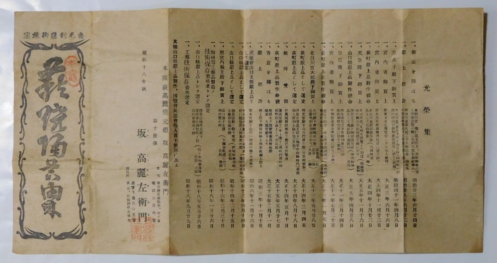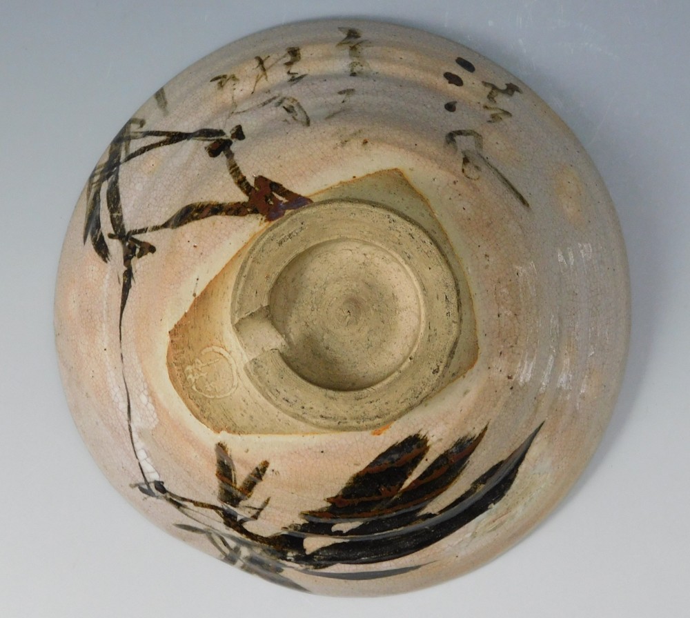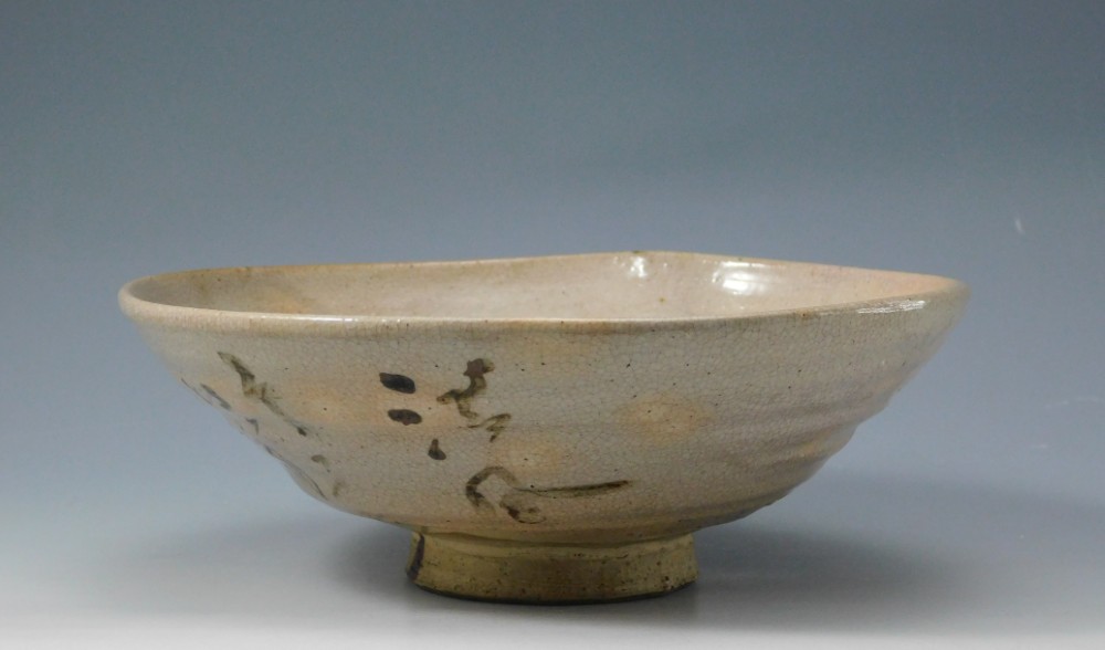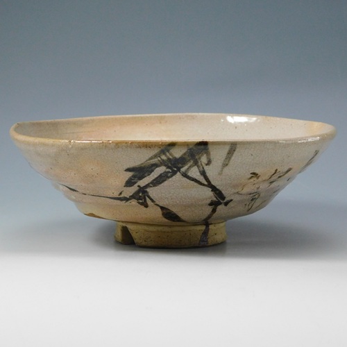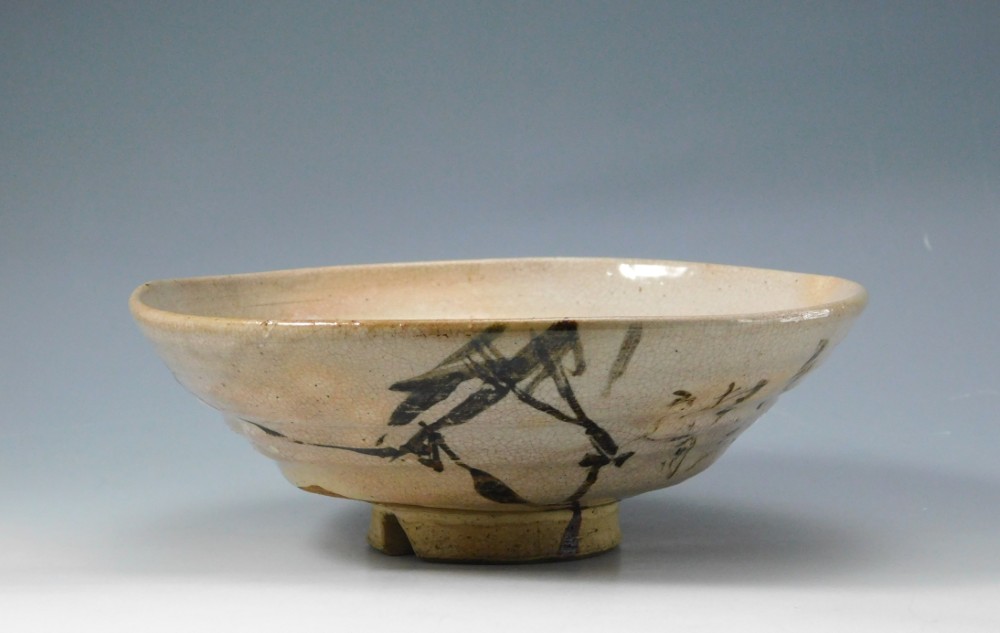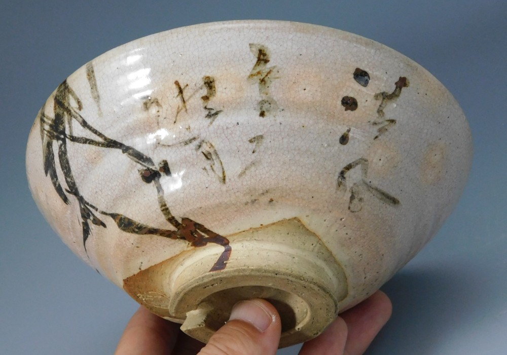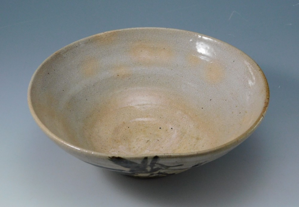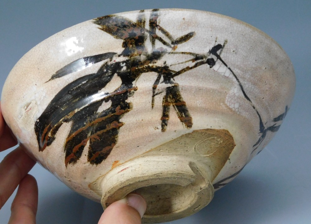 夏季に使用する萩焼の平茶碗であり、山口県萩市出身の画家、松林桂月が竹の絵を描いて「清風」と書いています。「韓峯」と茶碗に刻銘があることから、萩焼の名門、坂高麗左衛門窯において、十代
