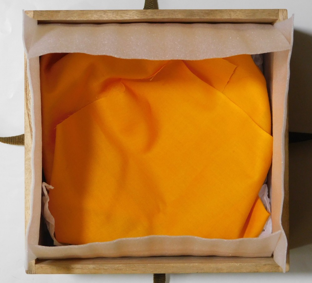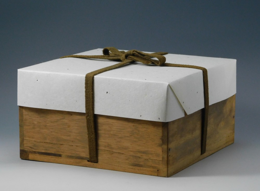 共箱としおりが付属し、また当店で黄布と薄葉紙、箱かぶせ紙を用意させていただきました。