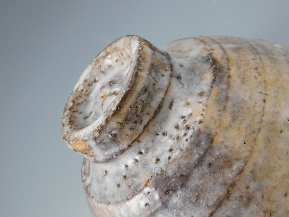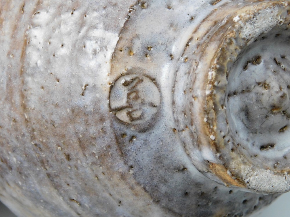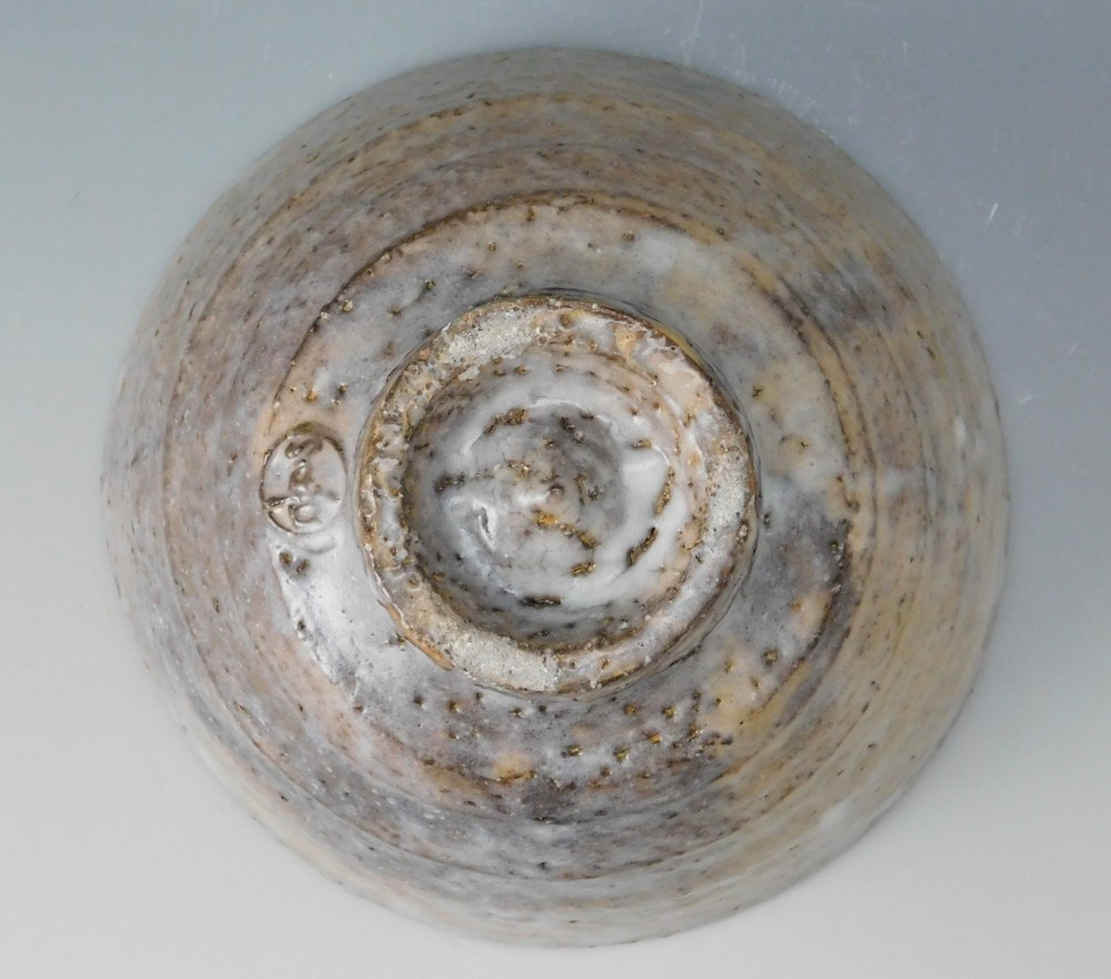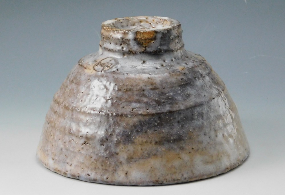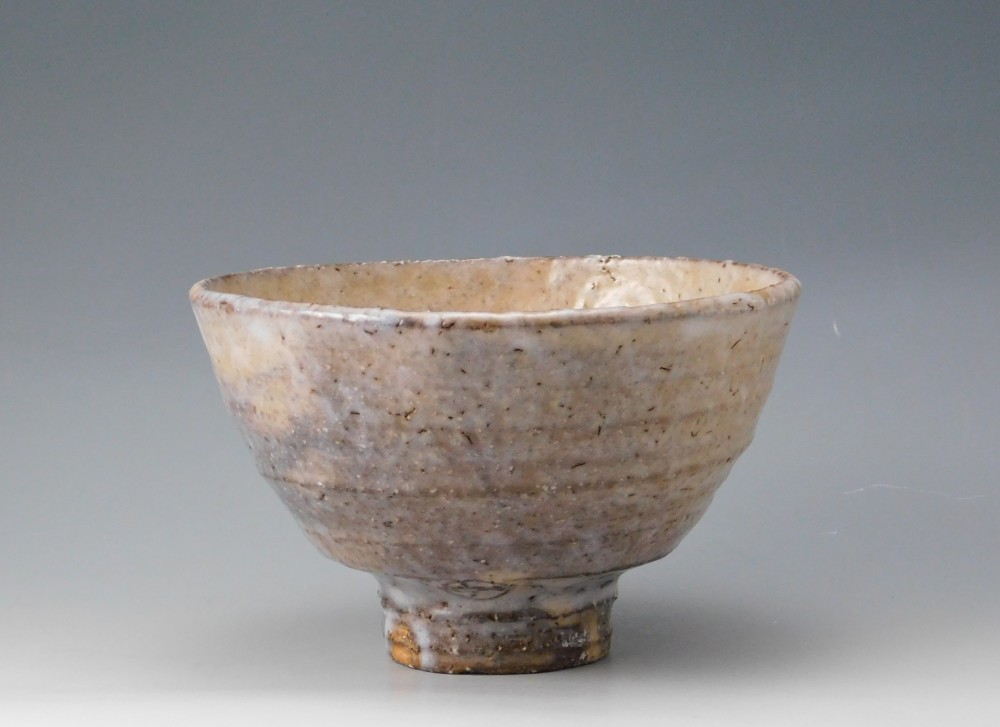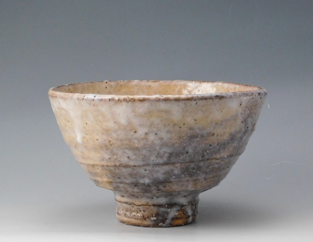 萩焼の伝統的な枇杷釉に、灰褐色の窯変が現れ、またかすかに白釉が全体を覆うことによって、様々な表情を見せるこのお茶碗は、間違いなく波多野善蔵氏の傑作のひとつであると言えます。